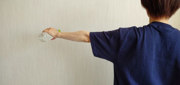 ペットボトルに水を入れて持ち、肩の高さまで横にゆっくりと持ち上げて7秒程そのままキープ。そしてまたゆっくり降ろす。