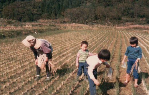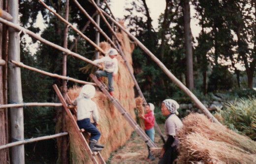 田舎の家族が作ったお米を食べている私ですが、子どもの頃は、姉弟力を合わせて手伝いをしてました。 (写真は今は珍しくなった稲架(はさ)掛けと稲刈り後の田んぼで落ち穂拾いの様子)